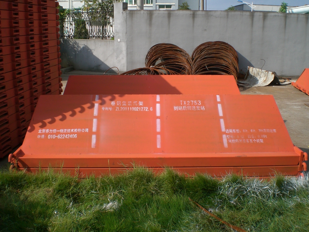 為了滿足國家提出的可持續發展要求,并根據各鋼廠實際運輸要求,我公司于2011年開發研制了一種可循環重復使用的卷鋼運載載具(以下簡稱卷鋼集裝托架)。可替代原凹形草墊臥裝方式,在實際使用過程中,大幅度降低卷鋼運輸成本,節約資源,達到可持續發展目標。并可根據鋼廠實際運營情況,提供循環回送服務。