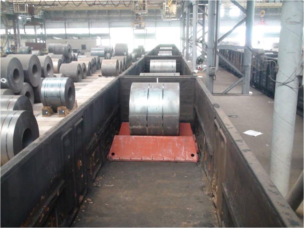根據目前國內各鋼廠鐵路運輸卷鋼的實際情況調查,卷鋼主要分為熱扎、冷扎和熱鍍鋅鋼卷及帶鋼等。每卷重量一般為3t—35t,卷徑一般在700—2250mm左右。近年來我國運輸卷鋼采用立裝、臥裝兩種裝載方式, 約60%產量采用凹型草支墊、草掩擋加固等臥裝方式運輸,其余均為立裝。